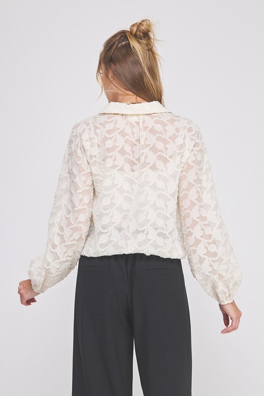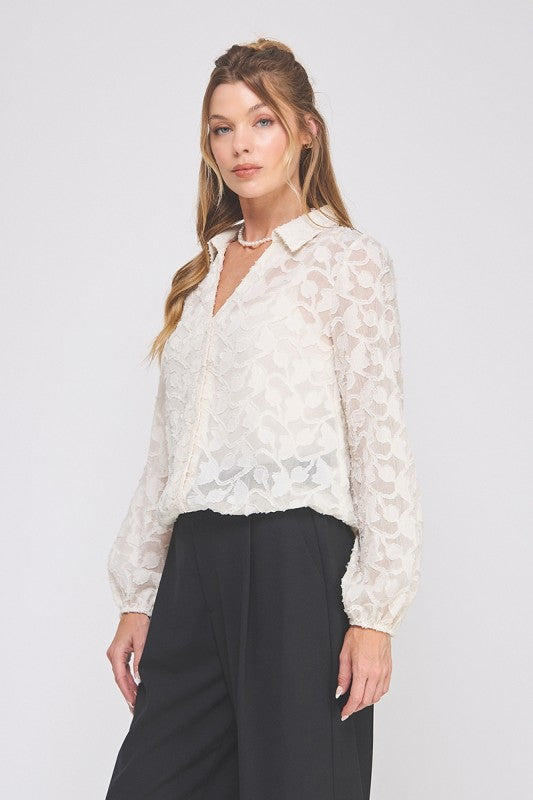 Elevate your everyday style with this cream jacquard long sleeve button-up blouse—a versatile piece that effortlessly transitions from office to weekend. The intricate jacquard texture adds visual interest and dimension, while the elastic waist creates a flattering silhouette that moves with you. Classic button-front closure pairs perfectly with tailored trousers or your favorite jeans. Soft, breathable fabric keeps you comfortable all day long. A timeless wardrobe essential that works as hard as you do.