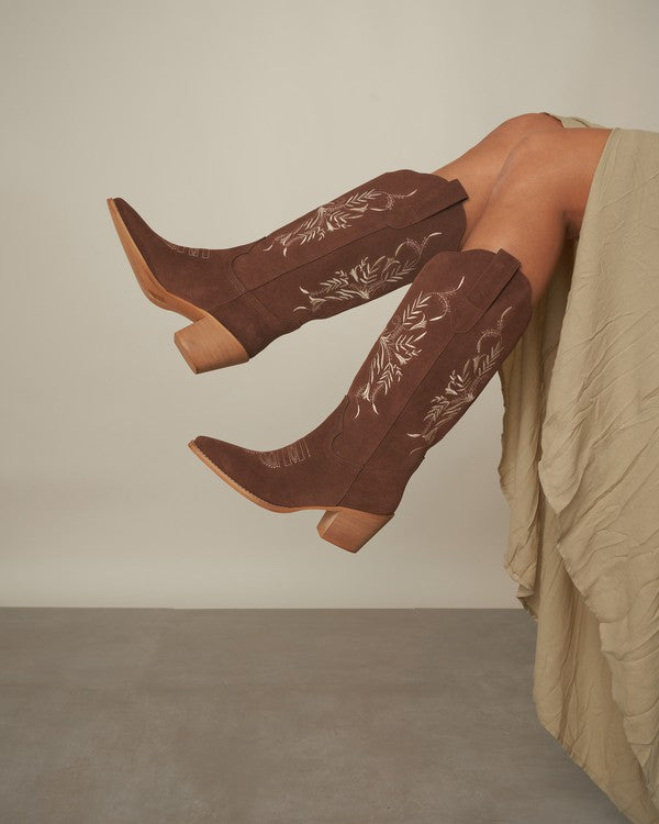 Step up your style game with the Flora Embroidered Brown Boot! These boots mix classic cowboy vibes with playful floral embroidery, adding a fun twist to your look. Made with sturdy leather and suede, they're ready for adventures from casual hangouts in jeans to dressier nights out. Add a splash of Western charm and feminine flair to any outfit with these eye-catching boots!