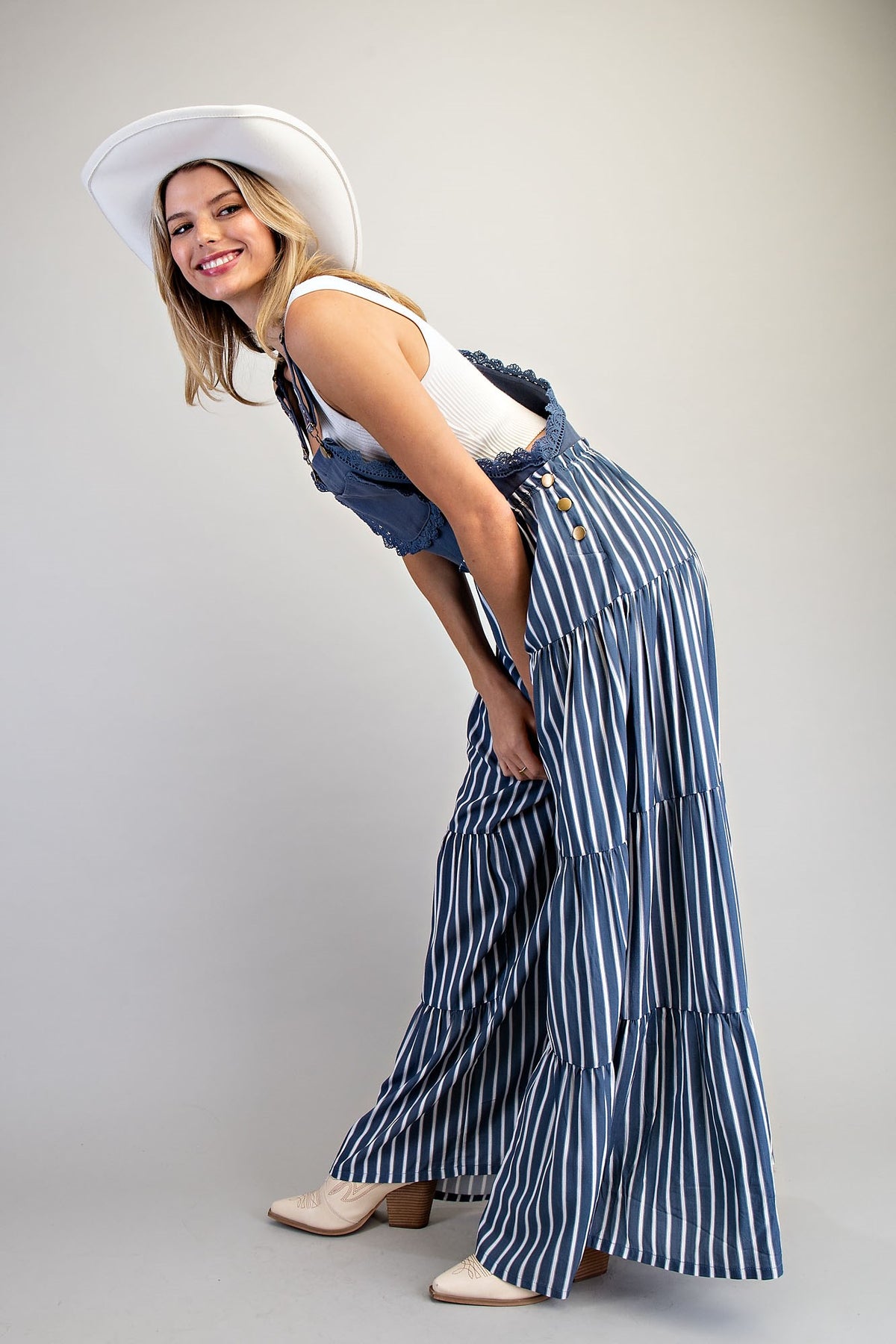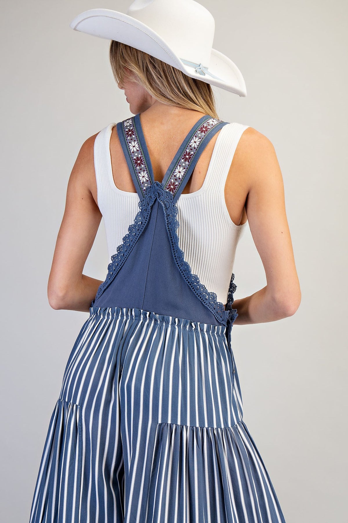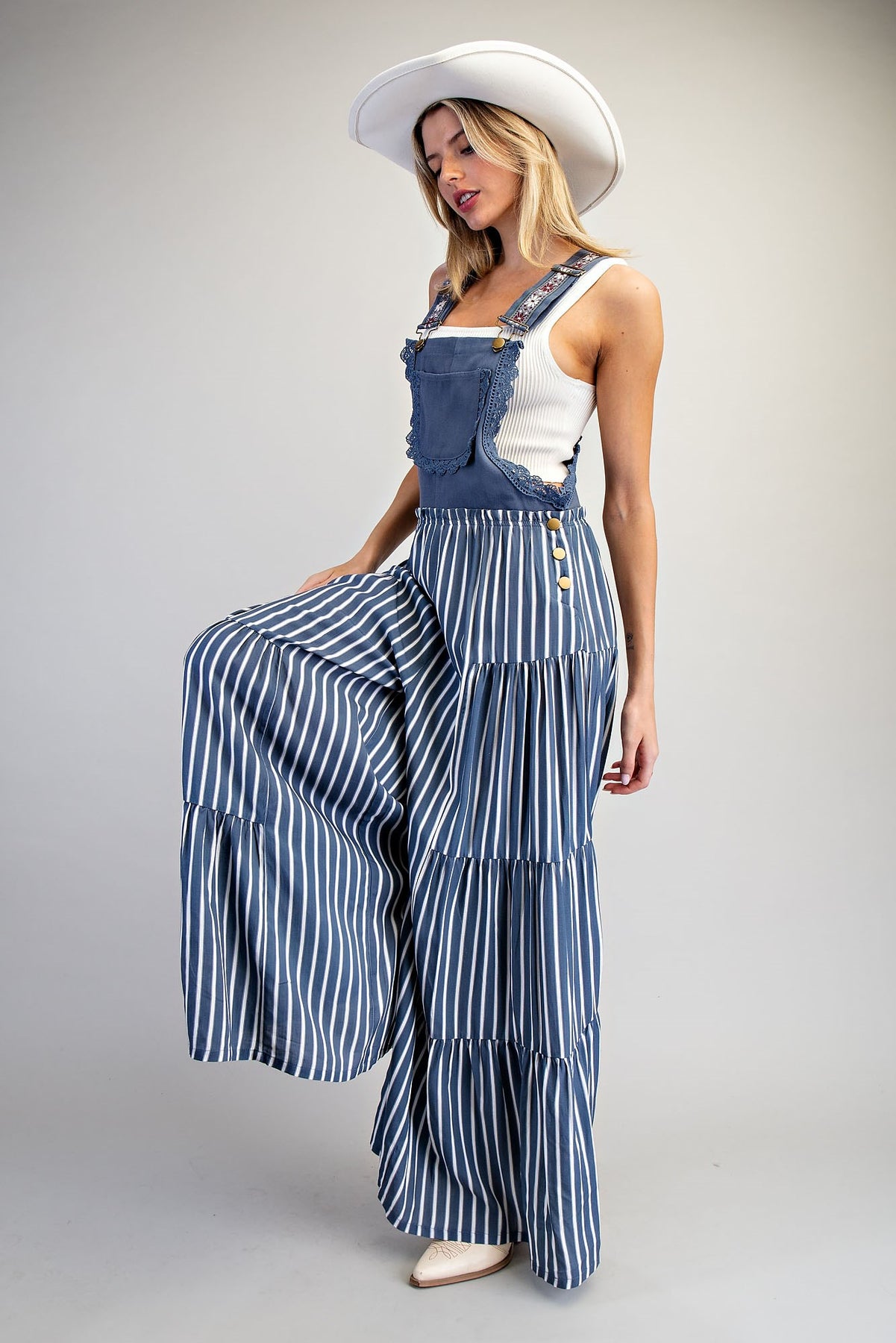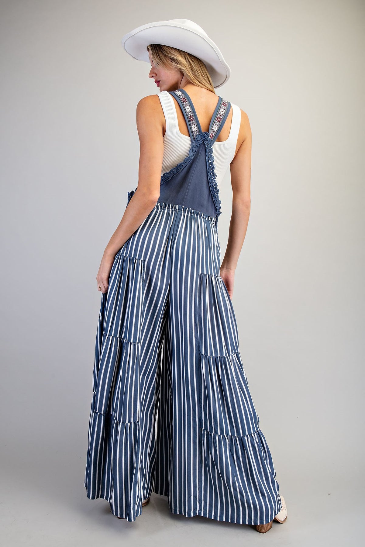 Embrace effortless style with this striped wide-leg jumpsuit that blends boho charm with modern flair. Featuring embroidered adjustable straps and a charming square bib front adorned with delicate scalloped lace trim, this piece moves beautifully with you. Side button closures ensure a perfect fit, while the tiered palazzo legs create a playful silhouette that's equal parts fun and sophisticated. Perfect for weekend adventures or dressed-up occasions.