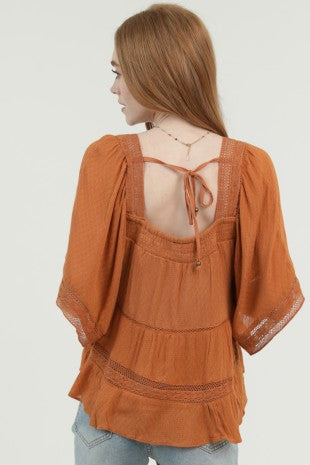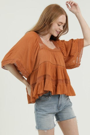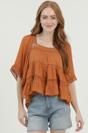 Embrace effortless elegance with this stunning white peasant blouse, a perfect blend of bohemian charm and modern sophistication. Crafted from lightweight, breathable textured fabric, this top promises comfort and style for any occasion. The delicate lace trim adorning the square neckline, flutter sleeves, and tiered ruffles adds romantic allure reminiscent of vintage-inspired designs. The relaxed fit and flowing silhouette create a flattering drape, while tiered ruffle detailing adds dimension and movement. Versatile and timeless, pair it effortlessly with denim for casual wear or dress it up with skirts and sandals for a polished look. The airy fabric keeps you cool and comfortable, while intricate lace elements elevate the simple silhouette into a statement piece. A must-have addition to any fashion-forward wardrobe, perfect for warm-weather days and transitioning seamlessly from casual outings to dressed-up events.