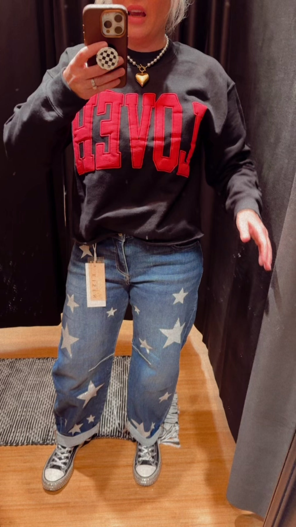 She's a star in these mid-rise ankle jeans that blend comfort with attitude. The relaxed barrel leg and star print give off effortless cool, while the 10½" rise sits just right on your hips. Rock them cuffed for an on-trend look or uncuff for extra length—you're in control. Perfect for anyone who wants their denim to do the talking. Featuring silver glitter stars