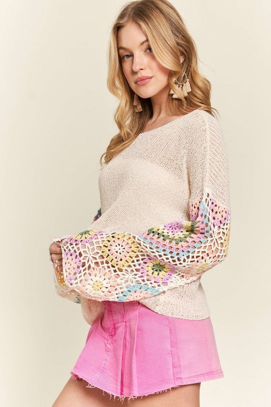 Embrace your boho side with this charming Soft Meadow Multi Crochet Top! Featuring vibrant multi-color crochet sleeves that steal the show, this lightweight knit delivers effortless style with a relaxed drop shoulder silhouette. The loose fit keeps things comfy and breezy, perfect for layering or wearing solo. Crafted from 100% polyester, it's easy to care for and ready for whatever adventure calls. A playful pop of color that works as hard as you do!