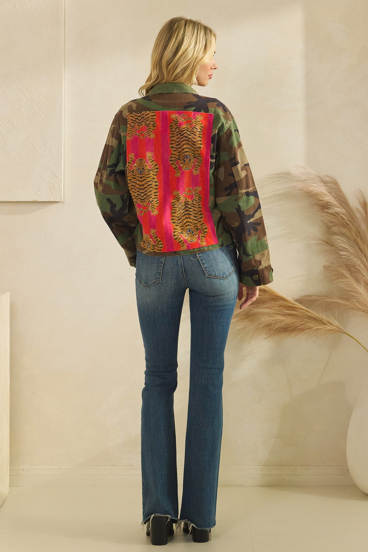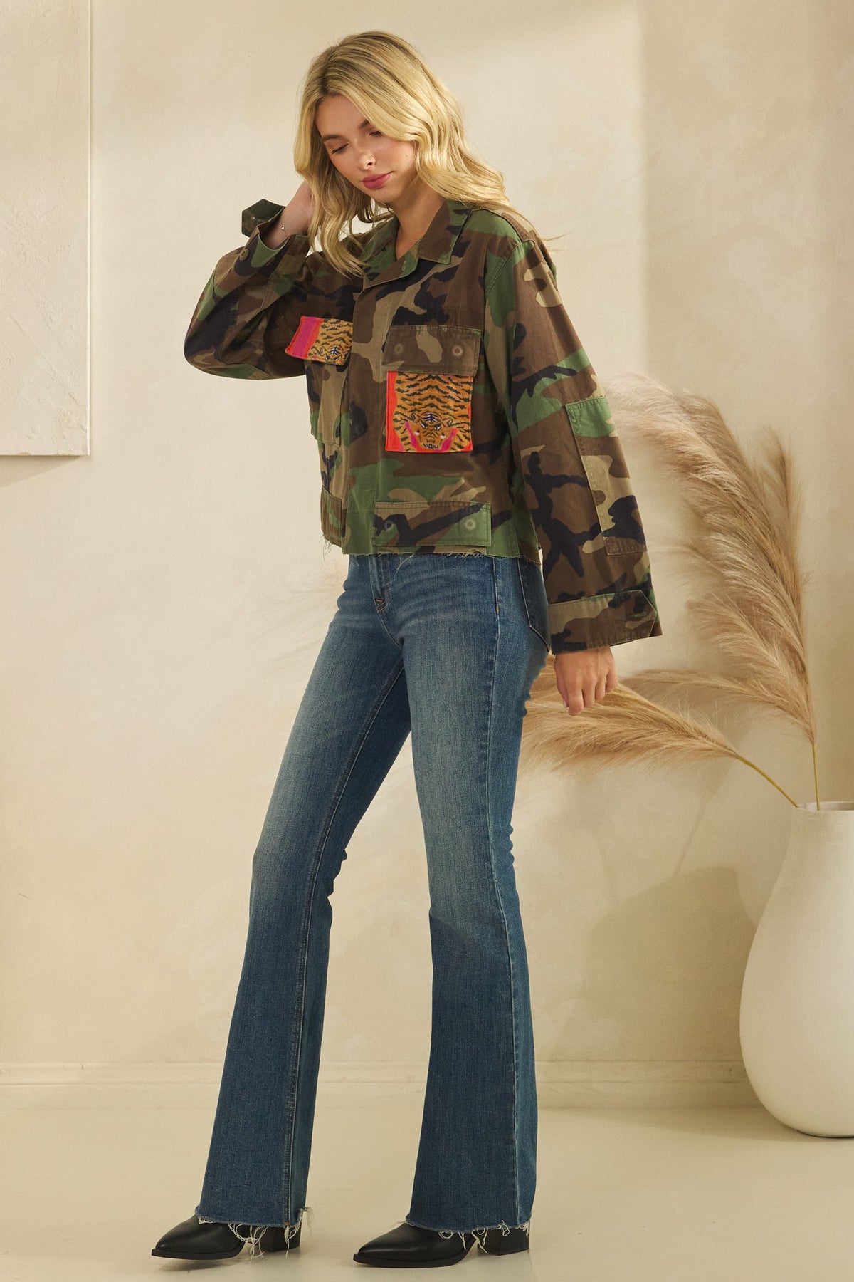 Make a bold statement with this cropped military-style camo jacket featuring vibrant tiger print and striped contrast details. The edgy combination of classic camouflage with eye-catching stripes and tiger motifs creates an undeniably funky aesthetic perfect for standout style. Structured silhouette with colorful printed back and pocket accents deliver personality and edge. A versatile piece that transforms any outfit into something uniquely daring and fashion-forward.