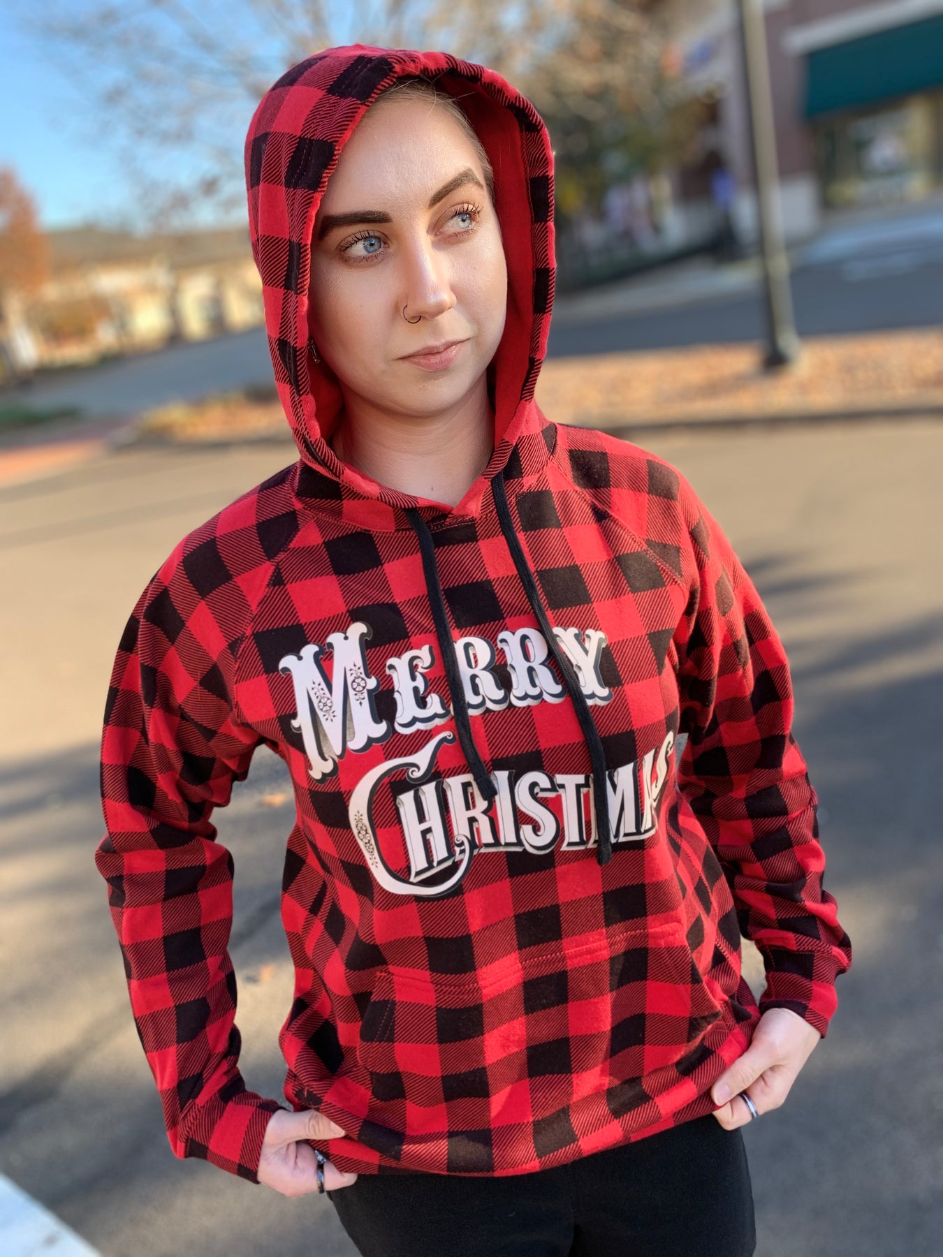 Cozy up to the holidays in this vintage Merry Christmas hoodie! Soft and comfortable, this hoodie features a timeless buffalo plaid pattern in festive red and black. With a classic Merry Christmas graphic print and a kangaroo pouch, it's the perfect way to spread some holiday cheer!