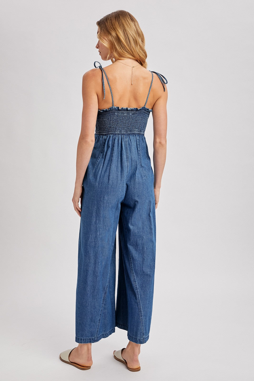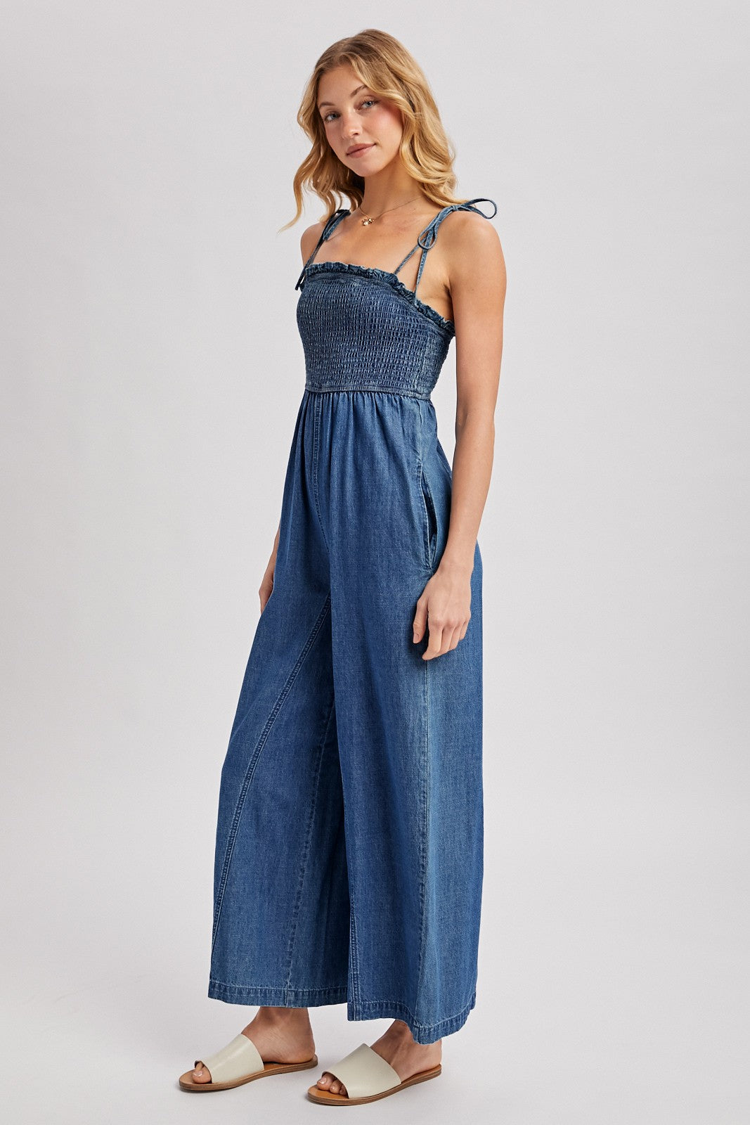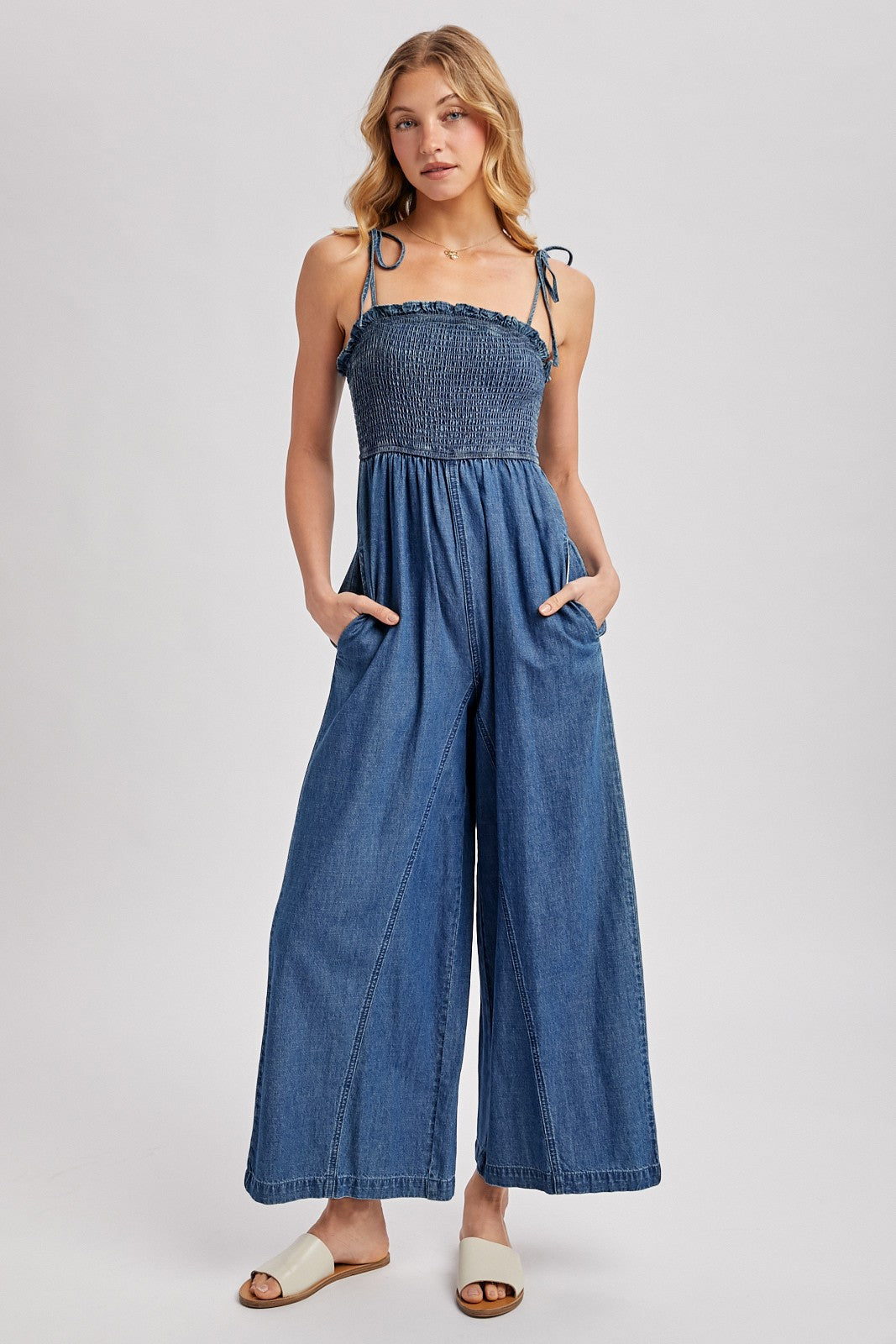 Throw on this denim smocked strap wide-leg jumpsuit and instantly level up your style game. The structured smocked straps keep everything in place while the relaxed wide-leg cut lets you move freely—perfect for everything from coffee runs to weekend adventures. Crafted in timeless denim, it's the ultimate one-and-done piece that pairs effortlessly with sneakers, boots, or sandals. Layer it, accessorize it, or keep it simple—this jumpsuit is your new go-to for looking put-together without trying too hard.