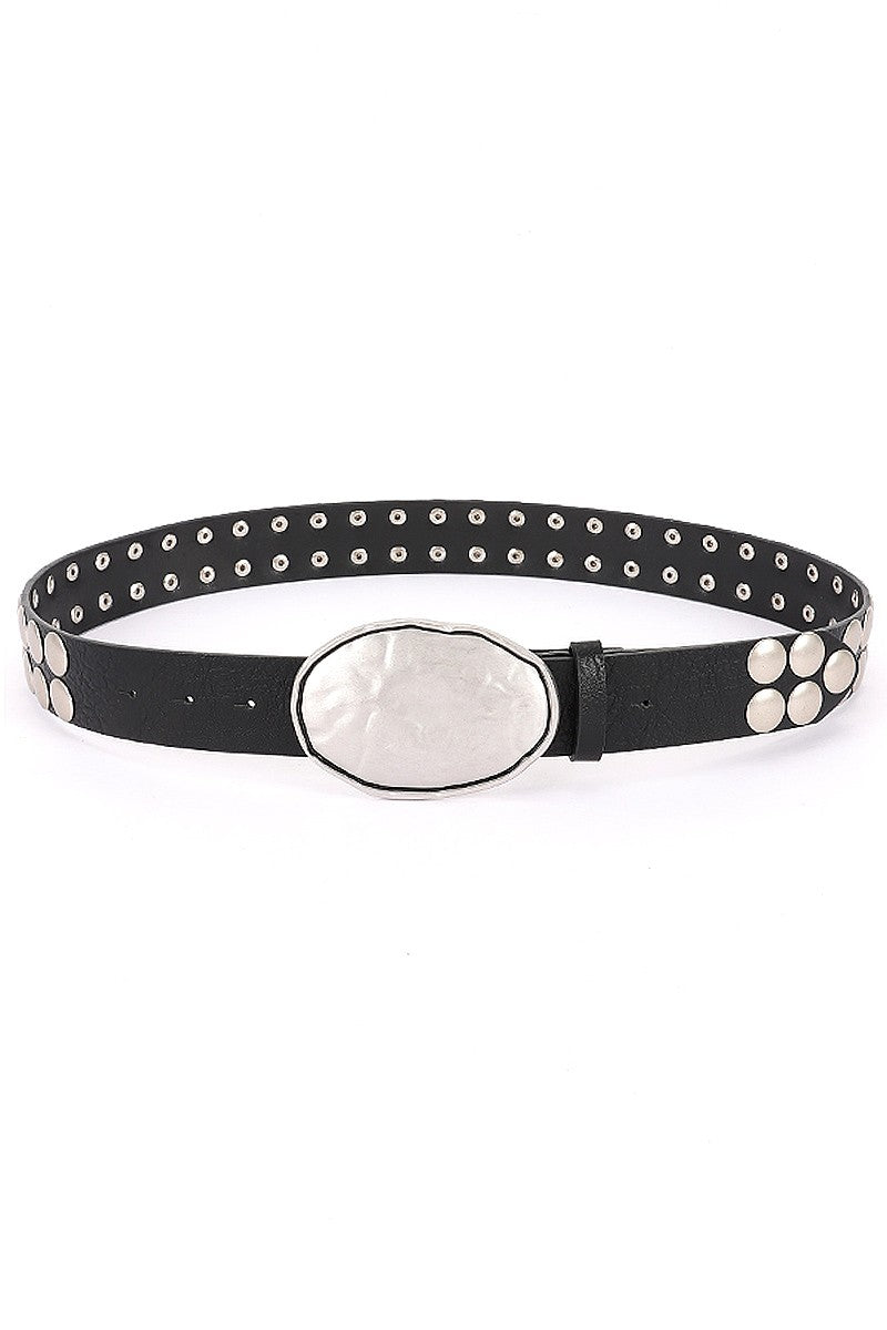 Rock your wardrobe with this faux leather studded belt that screams attitude. Featuring eye-catching metal studs and an oversized engraved buckle, it's the perfect edgy accessory to amp up any outfit—from casual jeans to western-inspired looks. At 1.5" wide and 43.5" long, this durable, versatile piece delivers serious style with a playful edge. Make a statement that's unmistakably you.