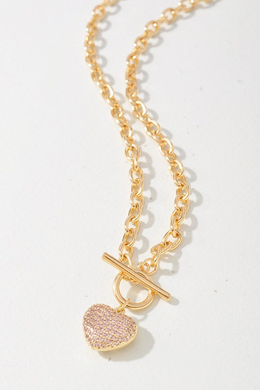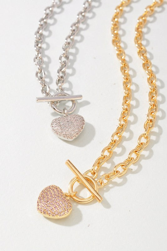 Steal hearts with this Metal Dipped CZ Heart Pendant Necklace—a dazzling blend of sparkle and sass! The brilliant cubic zirconia heart catches the light beautifully, while the rich gold-dipped finish adds that luxe touch without the luxury price tag. Paired with a bold chain and sleek toggle clasp, this necklace serves up modern statement vibes with a romantic twist. Lightweight enough for everyday wear but bold enough to turn heads, it's your go-to piece for date nights, casual outings, or gifting to that special someone. Adjustable 18" length with 1" extender ensures the perfect fit every time.