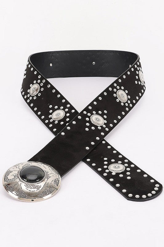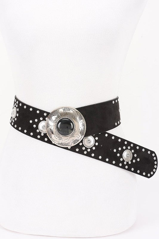 Saddle up for serious style with the Miri Studded Concho Belt—a Western-inspired stunner that demands attention. This beauty features a striking center concho adorned with a colored stone, paired with a buttery soft faux suede band studded with gleaming silver-tone metal details. At 2.25" wide and 46.5" long, it's the perfect width to make a statement without overwhelming your look. Whether you're cinching up a flowy dress, adding edge to your favorite denim, or turning heads at the next festival, this Southwestern showstopper brings authentic rustic charm and undeniable personality to any outfit.
