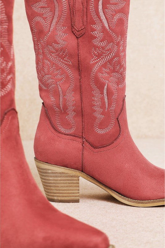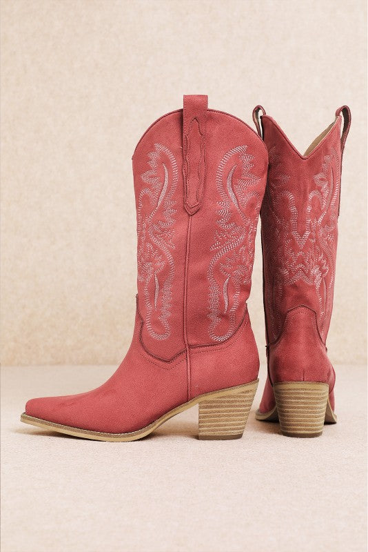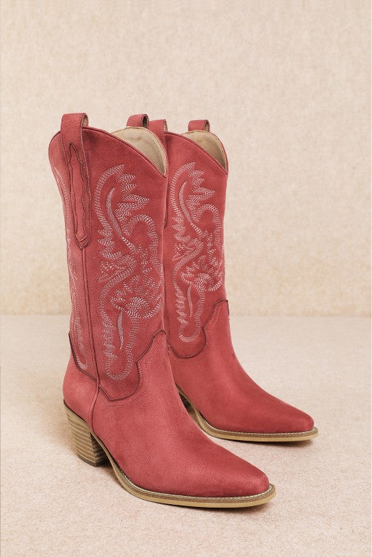 Make a statement with the Orren Suede Western Boot. Designed in a rich dusty-rose suede, this mid-calf boot features classic western stitching that adds depth and artistry to its sleek silhouette. The pointed toe and stacked block heel keep the look rooted in cowboy tradition, while the vibrant color brings a fresh, modern twist. Perfect for adding a pop of personality to denim, skirts, or dresses, the Orren is a confident blend of western heritage and contemporary style.