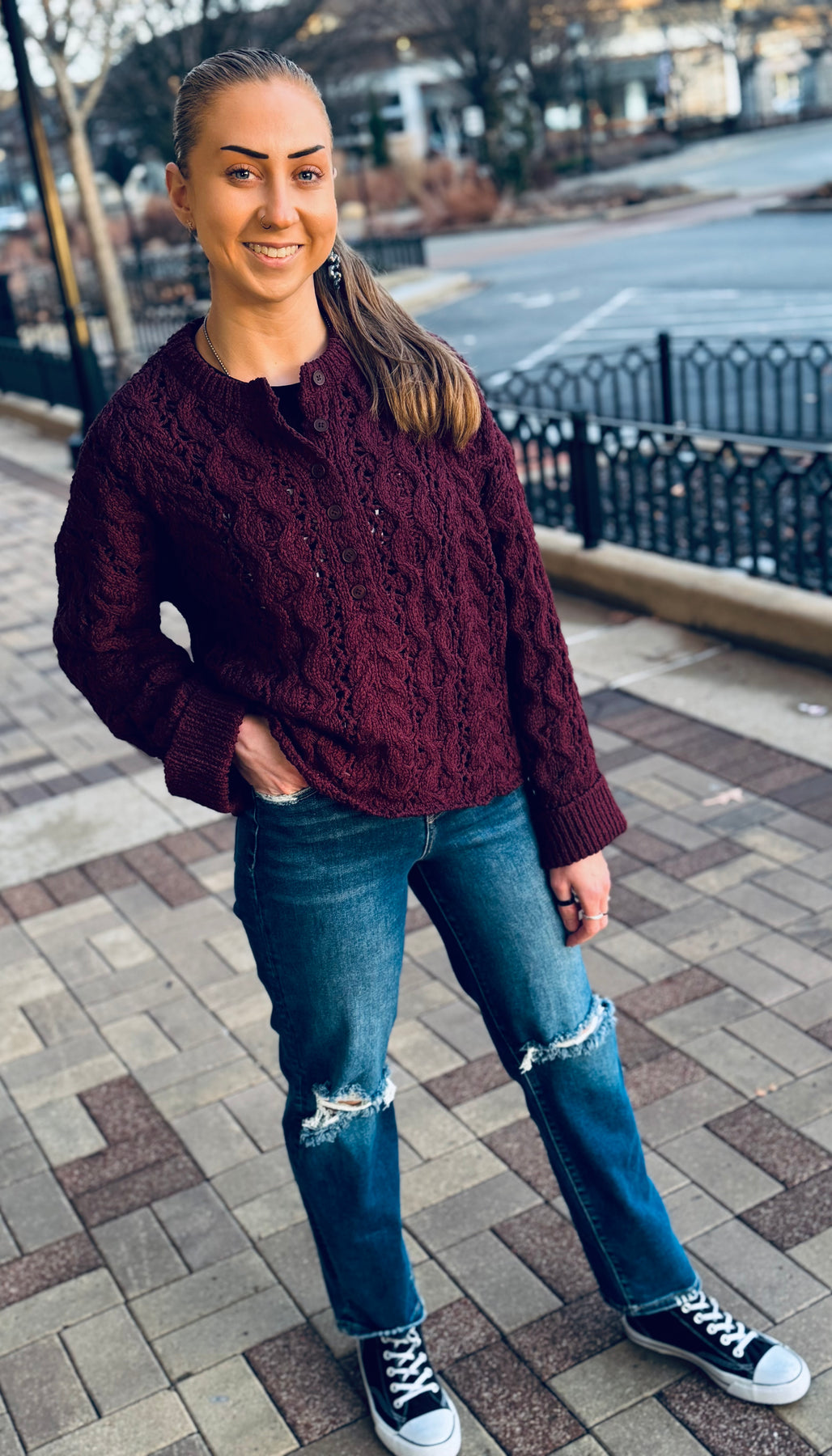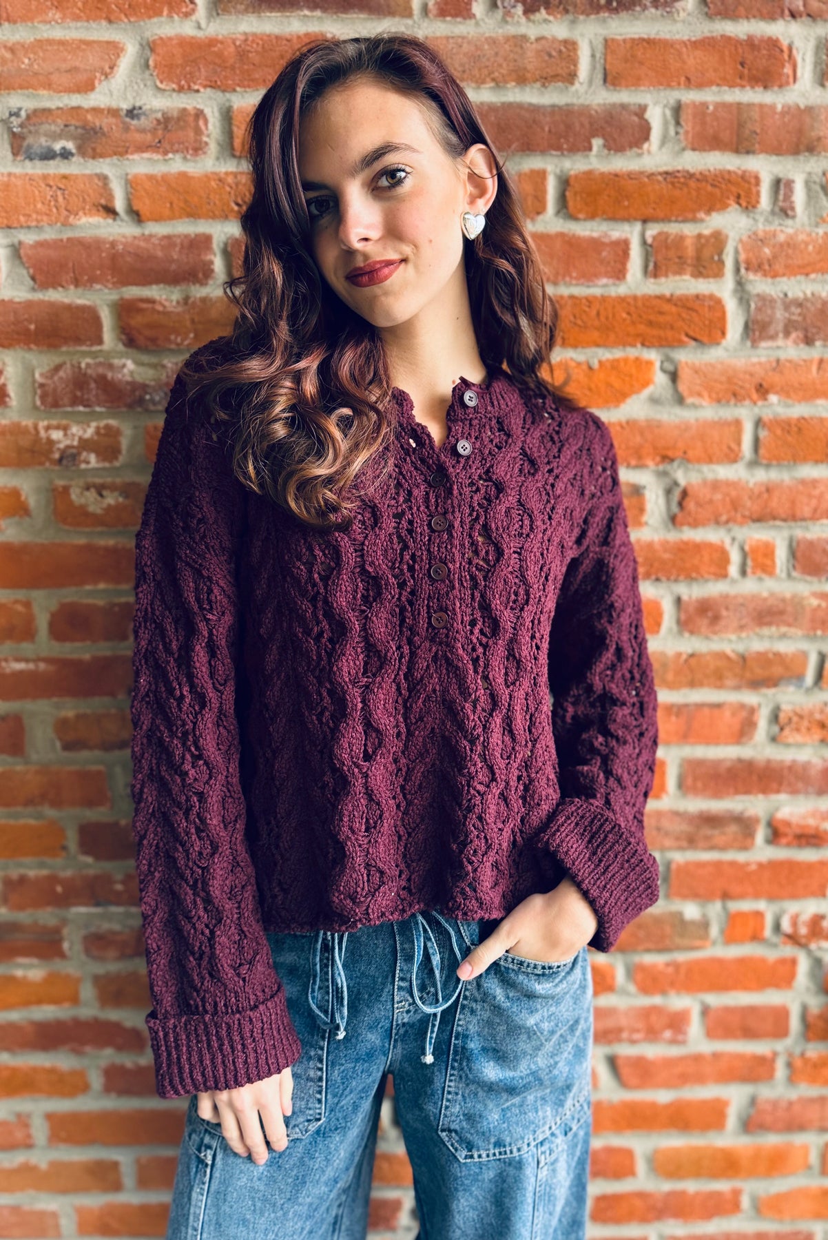 Layer up with the Andy Half Button Down Sweater in rich maroon! This cozy knit features a mix of cable and open-knit textures that add serious visual interest to your everyday look. The half-button placket gives you easy styling options, while the rounded neckline keeps things classic and flattering. Wide ribbed cuffs ensure a snug, comfortable fit. Perfect for those moments when you want texture, warmth, and a touch of effortless cool.