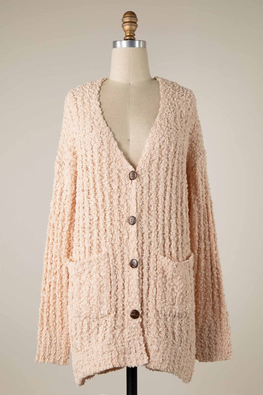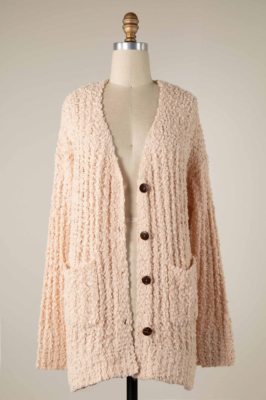Wrap yourself in cozy charm with this Light Peach Popcorn Cardigan! Featuring a textured popcorn knit that's as fun to touch as it is to wear, this long-sleeve button-down delivers effortless style. The patched pockets add a playful touch, while the ribbed trim keeps everything perfectly in place. Crafted from a breathable cotton and acrylic blend, it's your new go-to layer for casual days and laid-back vibes. Soft, stylish, and ready for anything.