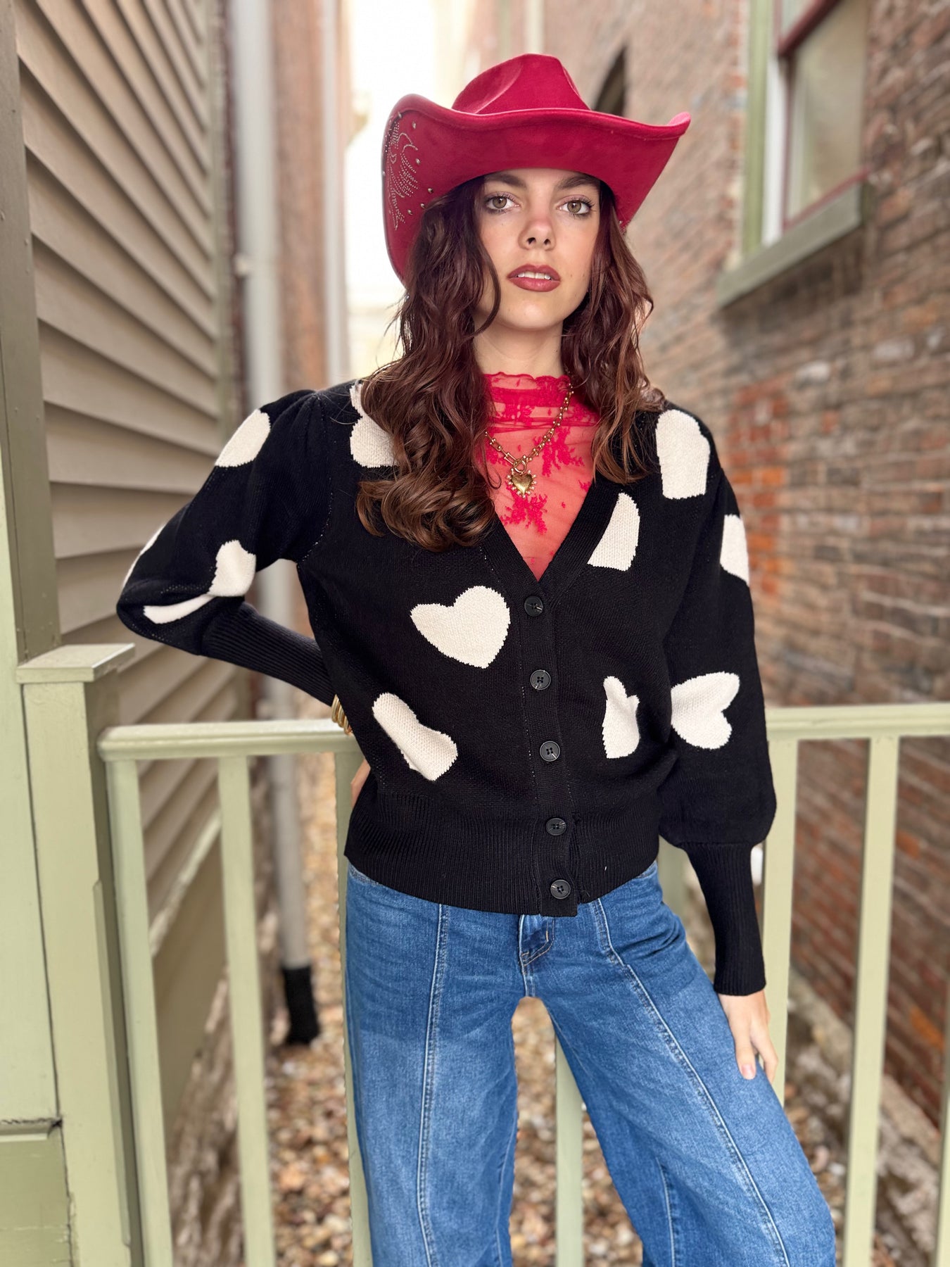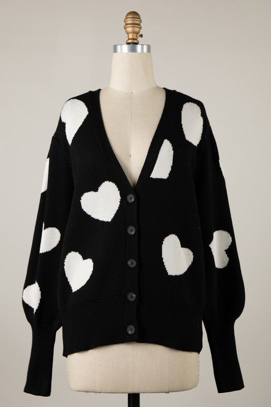 Adorable scattered heart pattern meets cozy comfort in this button-down cardigan! Crafted from a soft cotton and acrylic blend, it's the perfect layering piece for adding warmth and whimsy to any outfit. Whether you're dressing up a casual look or keeping things relaxed, this charming cardigan brings a touch of sweetness to your wardrobe. Slip it on and let your style speak volumes.