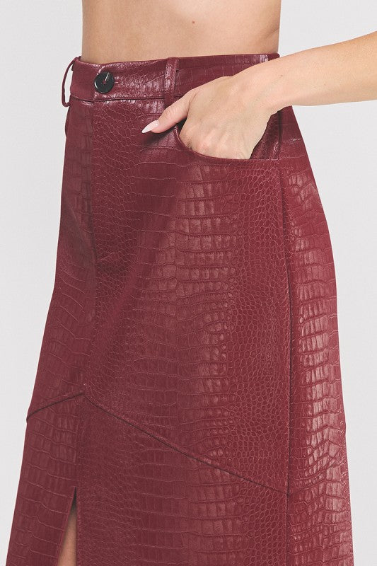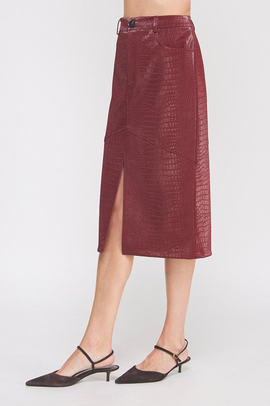 Slither into style with our Wine Faux Python Skirt—a bold midi that brings serious attitude to your wardrobe. Crafted from luxe faux snake leather, this piece features a cheeky front slit that's equal parts sultry and practical. Perfect for nights out or turning heads at any occasion, it's the edgy essential every fashion rebel needs. Vegan-friendly and undeniably fierce.