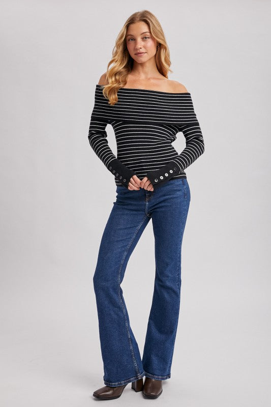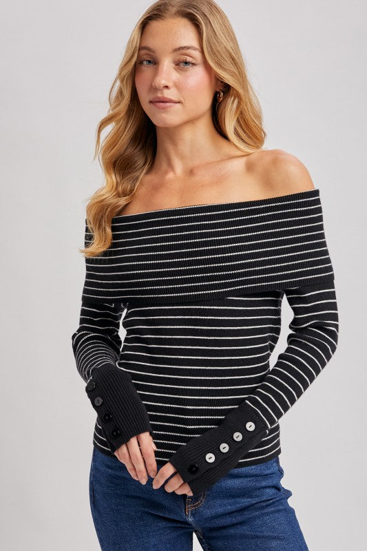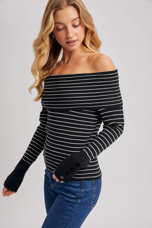 Strut your stuff in this cheeky off-the-shoulder stunner! Featuring bold horizontal stripes in crisp white against a rich black and latte blend, this fitted knit top is pure sass. The ribbed texture hugs you in all the right places, while long sleeves keep things classy—until those adorable button accents at the cuffs steal the show. Stretchy and comfortable, it's the perfect piece for turning heads whether you're hitting the town or just living your best life.
